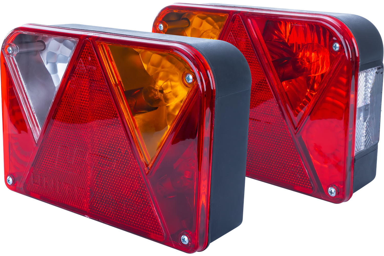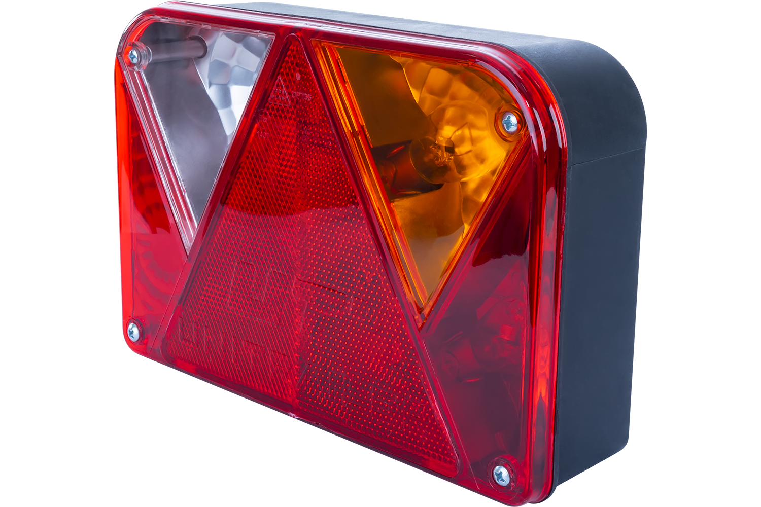 La luz izquierda está equipada con luces de posición, luces de freno, luces indicadoras, luces antiniebla, luces de matrícula y un triángulo reflectante.